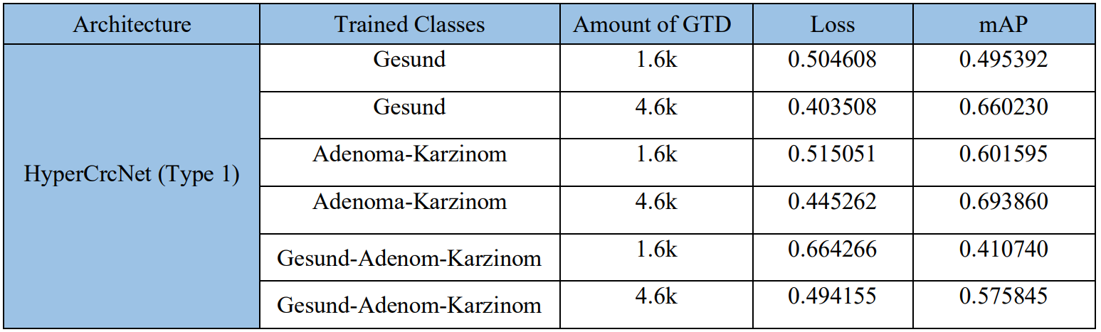 For HyperCRC-Net Type 1 using Instance Segmentation, we observe a clear trend: as the number of GTDs increases, the loss function decreases, while the Mean Average Precision (mAP) improves. This demonstrates that the model is effectively learning to identify and segment instances within the dataset.