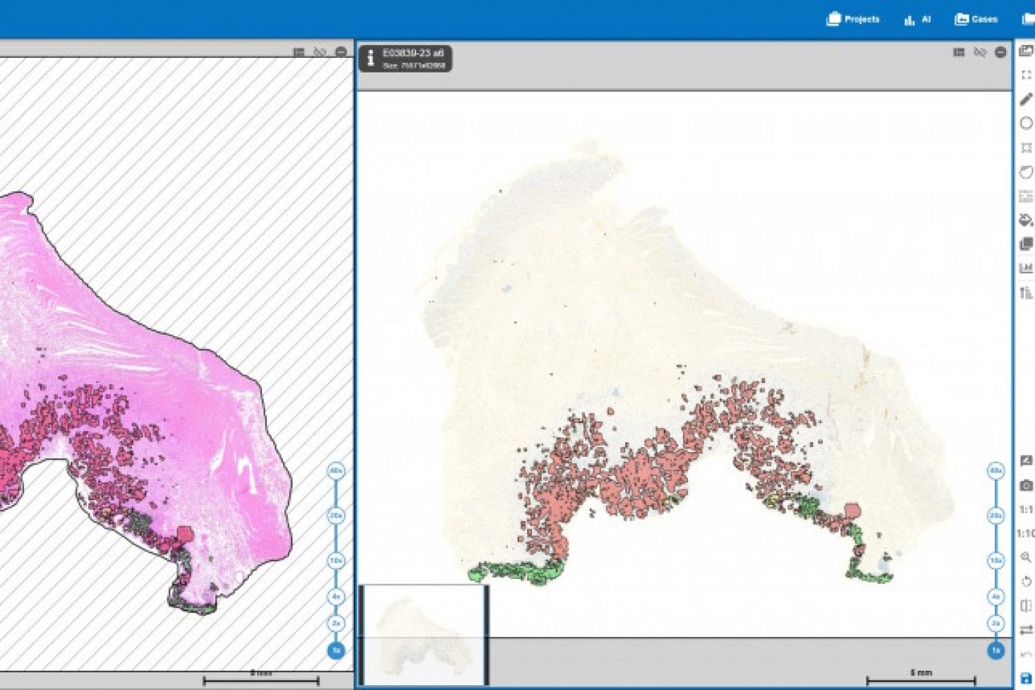 The ability to access and review previous cases stored in the platform’s database supports continuous learning and improvement in medical practices. Additionally, the integration between the case viewer and file viewer ensures that all pertinent information is easily accessible, allowing for a thorough examination of tissue sections directly from the case viewer.