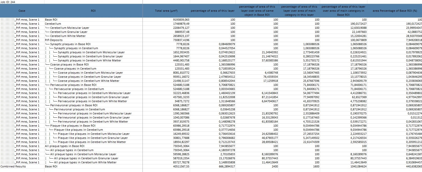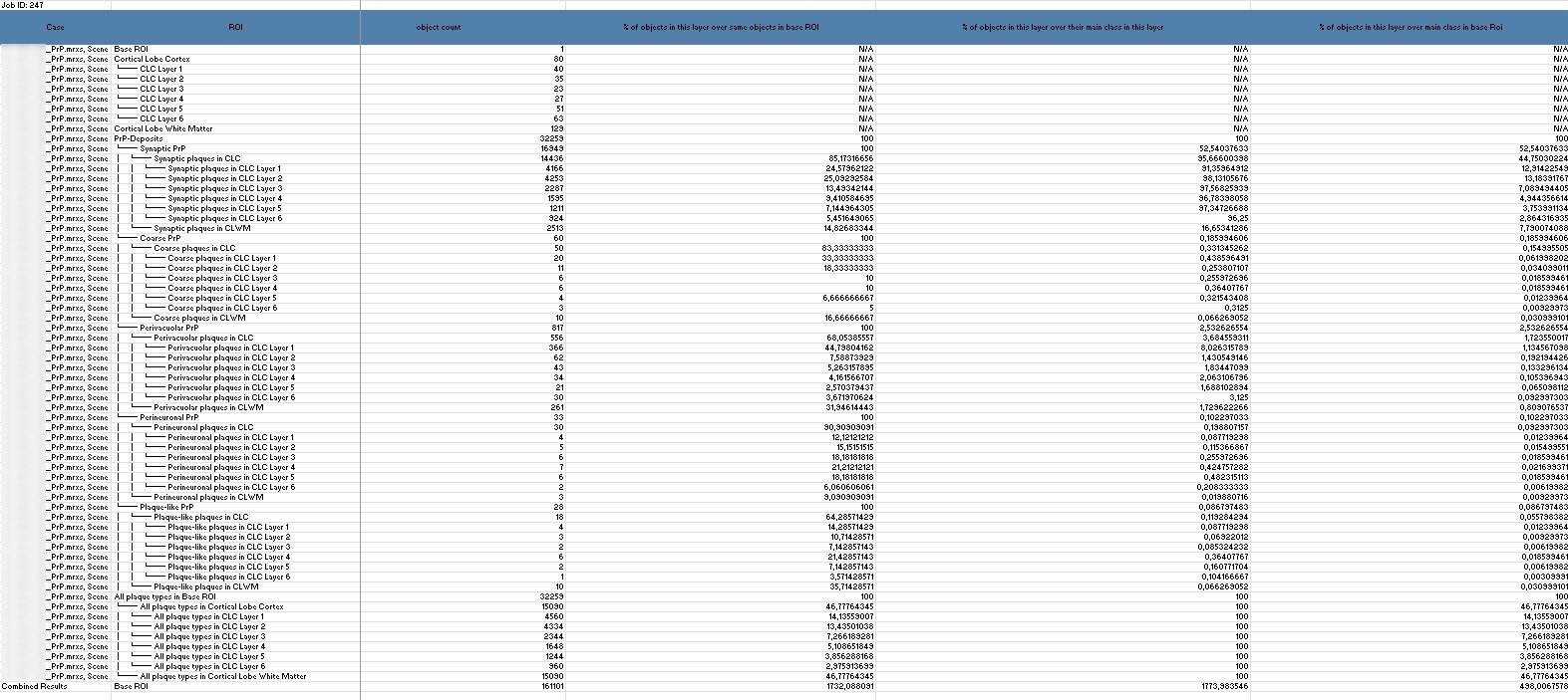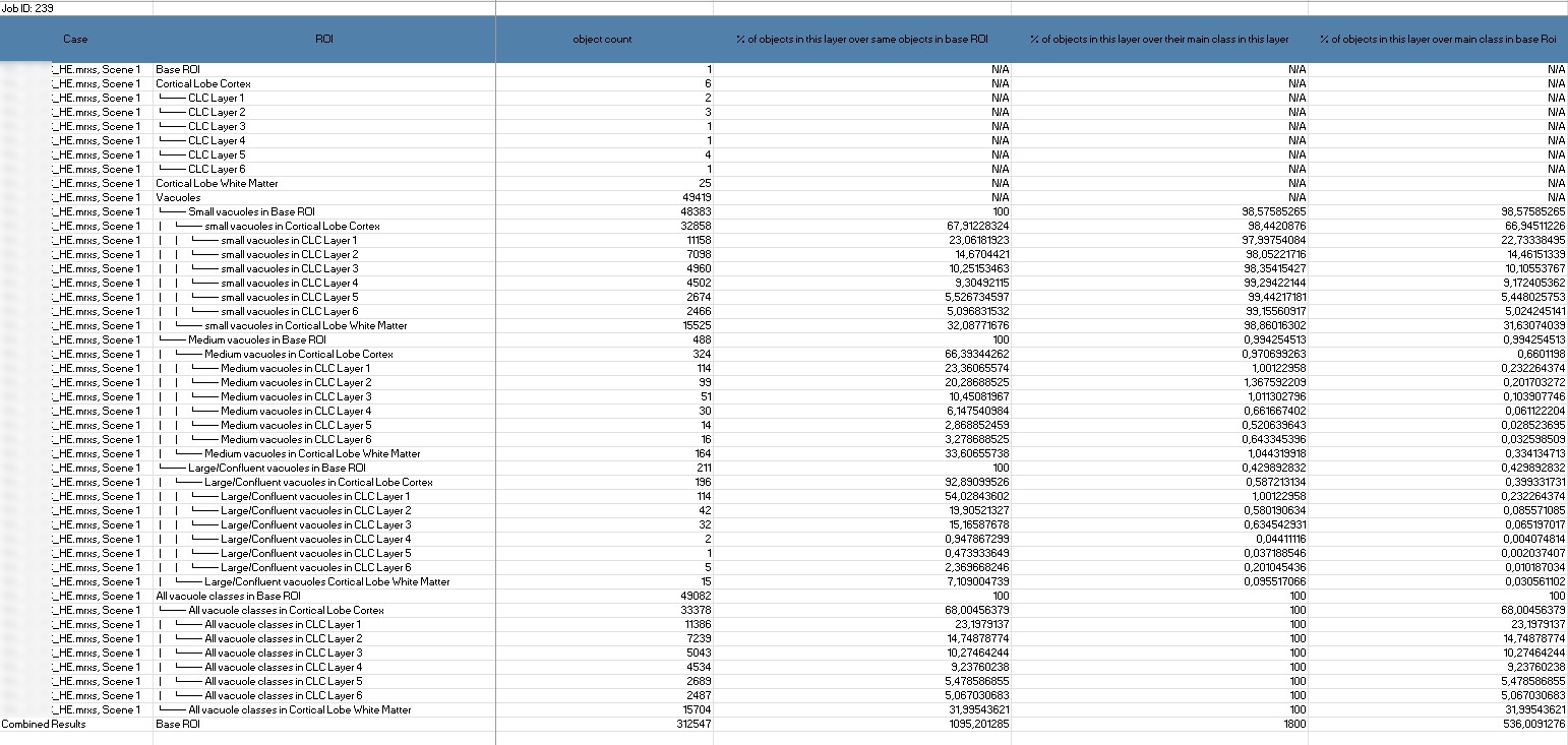 The main goal of this analysis, conducted with HSA KIT software, is to draw conclusions on specific subtypes of CJD using the metrics mentioned. Since different subtypes show significant differences in the number and distribution of structures in certain layers, analyzing these differences allows for subtype classification through AI.