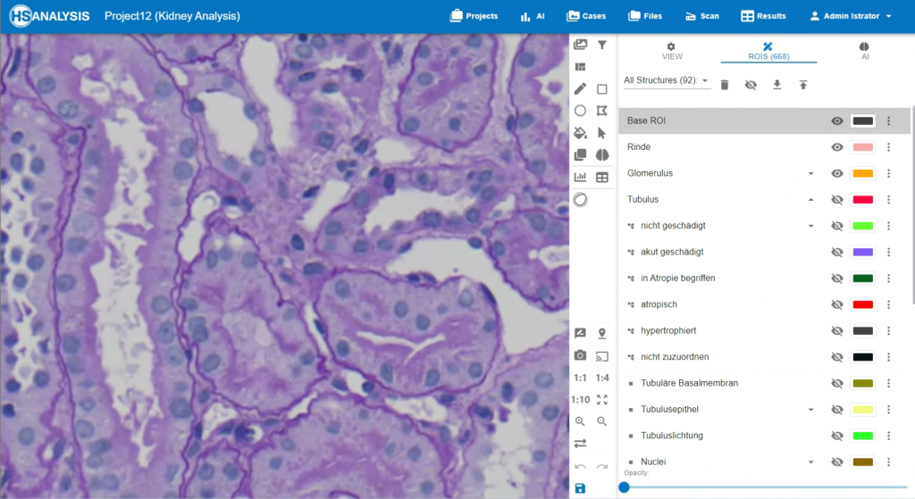 Der gezeigte Bild stellt die Benutzeroberfläche des HSA KIT`s dar, mit besonderem Augenmerk auf die Tubuli einer Nierenhistologieprobe. Der KI-basierter “Kidney Analyser” zeichnet sich durch die Fähigkeit aus, Tubuli mit hoher Genauigkeit zu umranden. Diese Präzision erlaubt es dem System, automatisch die Anzahl und die Fläche der Tubuli zu ermitteln.