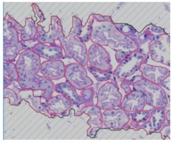 This picture shows a second dyed and microscope-observed histological slice, most likely at a different magnification or area. The tissue’s different features are indicated by the red outlines. These structures resemble tubules or glandular forms, presumably from a kidney or similar glandular organ. Due to efficient staining, the picture quality is excellent and allows for simple identification of nuclei and other cellular elements. There is also a clear distinction between cellular and extracellular components. The number of indicated structures suggests a careful method of emphasizing particular regions of interest, implying a thorough examination for research or diagnostic reasons. The tissue architecture can be seen in great detail thanks to the exceptional resolution, which makes it an invaluable tool for histopathological analysis.