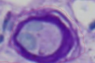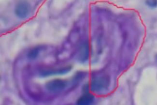 This image appears to be a microscopic view of a tissue sample, likely stained using a method such as Hematoxylin and Eosin (H&E) to highlight cellular structures. The deep purple areas represent cell nuclei, while the lighter purple areas are the cytoplasm and other tissue components. The red lines overlaying the image indicate that an AI tool has been used to annotate specific structures within the tissue. These annotations typically highlight important regions of interest, such as cell boundaries or areas indicative of pathological changes. The precision of the annotations suggests that the AI model is proficient in recognizing and delineating complex biological structures, which is crucial for tasks like histopathological analysis. The AI’s ability to accurately annotate these features can assist pathologists in diagnosing diseases, ensuring that subtle morphological changes are not overlooked. This combination of AI and histology exemplifies how technology can augment traditional medical practices, leading to more efficient and accurate diagnostics.