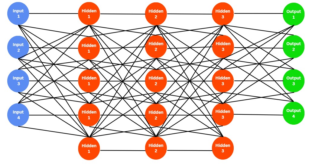 - The network has 3 hidden layers, each containing 5 nodes labeled as “Hidden 1”, “Hidden 2”, and “Hidden 3”.