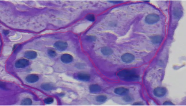 As you can see in This image is a microscopic view of a tissue sample stained with Hematoxylin and Eosin (H&E), highlighting cell nuclei in deep purple and cytoplasm in lighter purple. The red lines are AI-generated annotations, accurately outlining cell boundaries and key structures. The precision of these annotations showcases the AI’s capability in histopathological analysis, aiding in disease diagnosis by providing reliable and consistent identification of cellular components. This integration of AI enhances the efficiency and accuracy of medical diagnostics.