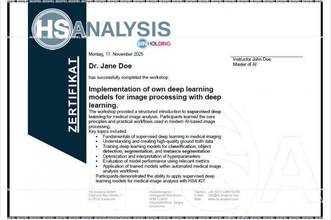 With the HSA Workshops, HS Analysis provides specialized training for engineers and medical professionals to learn artificial intelligence in image processing with a focus on deep learning applications. Engineers and Doctors can learn to collaborate with HSA KIT for an interactive, efficient learning experience. Upon workshop completion, participants will receive certification in deep learning implementation skills.