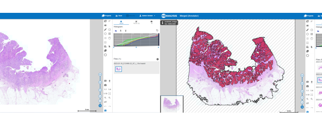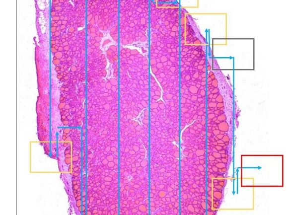See the true supreme tissue detection quality that our HS Analysis KIT can do on a small portion of a much larger whole slide picture of CC that was able to differentiate types of tissue and detected the exact diameter of each tissue.