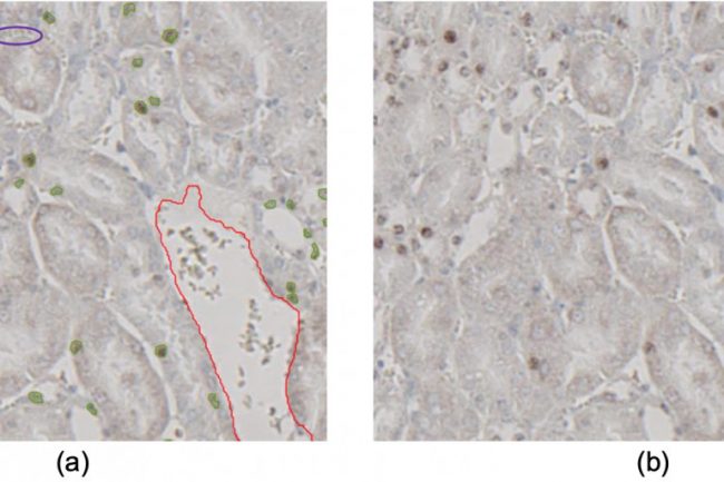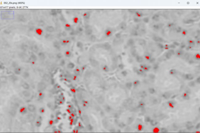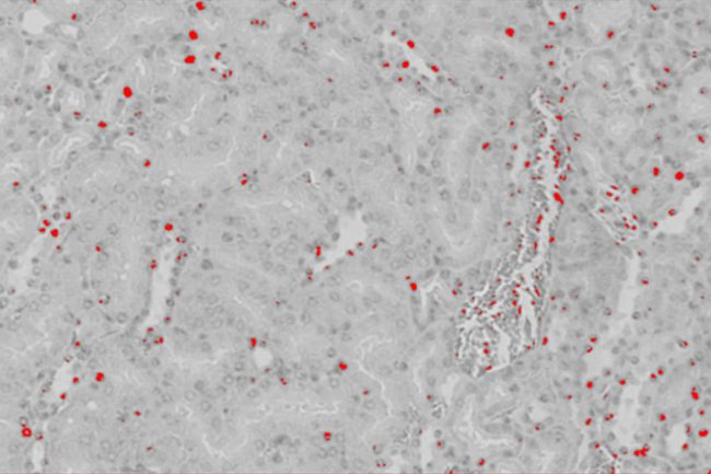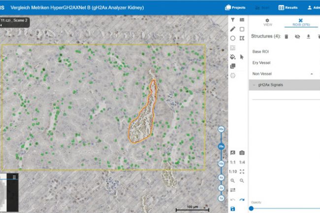 To optimize the detection of gH2AX signals, two deep learning models were trained. The first model, called “HyperNonVesselNet,” is designed to detect erythrocytes and blood vessels. It divides the entire kidney into non-vessel and vessel areas. The goal is to identify the relevant areas or objects in an image and separate them from the background and/or other objects.