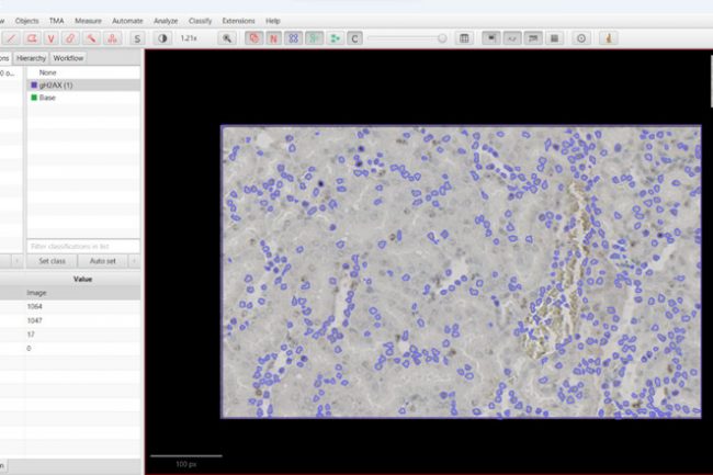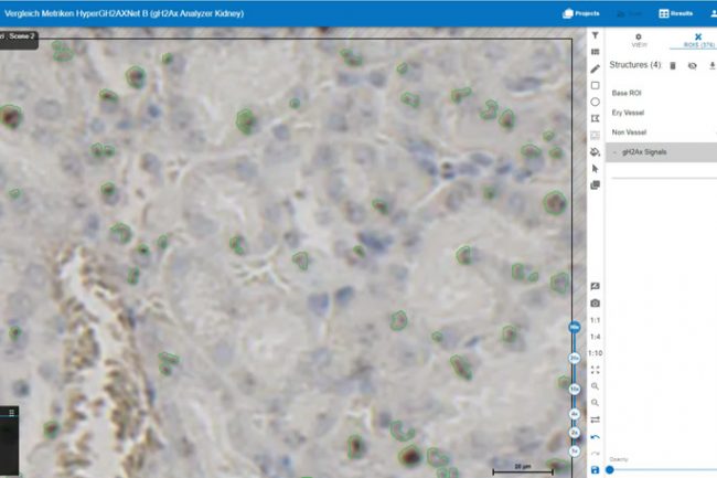 In order to verify the plausibility of the software results, the sections were individually examined. All structures automatically identified by the HSA KIT were considered, including the non-vessel area, erythrocytes or vessels, and gH2AX signals. Initially, the entire kidney was examined to rule out major errors. Subsequently, using a mouse kidney as an example, the displayed and hidden structures were compared.