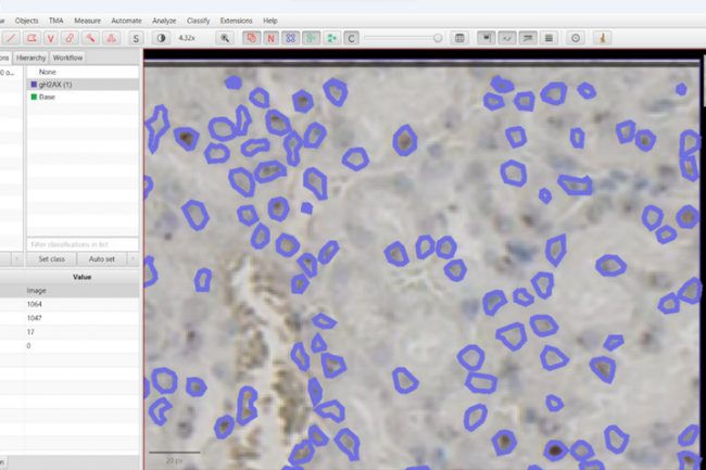 With the HSA KIT, it is possible to adjust certain parameters according to the sections. Care was taken to choose these parameters in a way that allowed for the automatic detection of as many manually identified γH2AX signals as possible. Additionally, the entire area of these signals was considered, as later in the study, the calculation of the signal area was intended.