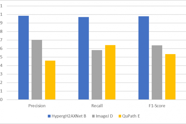 With these data a column chart was created where the blue column is the HSA HypergH2AXNet, the black column ImageJ and the last one (yellow) QuPath. The metrices precision, recall and F1-score were calculated for each of them to compare the methods better.