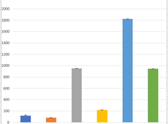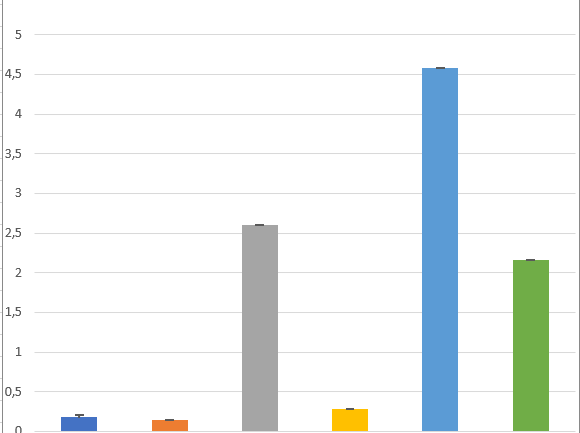 It can be observed that the animals from group 1 incubated with the substance for only two hours (darkblue bars) have incurred a less amount of damage. The bar representing the 15-hour values of group 1 (orange) shows the lowest level of damage. The animals from group 2, which were incubated for 2 hours (grey) indicate a similar level of damage as group 3 (green). The group 3, which shows the highest damage, was incubated for 2 hours (light blue).