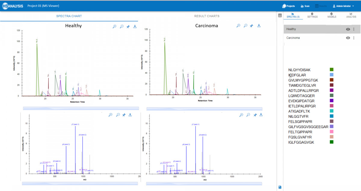 There is a possibility to view peaks and spectra of peptides in real time, alongwith corresponding proteins from the spectral library. Additionally, the MS Viewer module allows for the comparison of multiple samples to identify differences in protein expression levels or modifications. This comprehensive tool is essential for researchers looking to uncover key insights from their mass spectrometry experiments. One application is to compare MS peaks in Healthy and Cancerous tissues where any misbehavior of peptides can be easily spotted and analysed further.