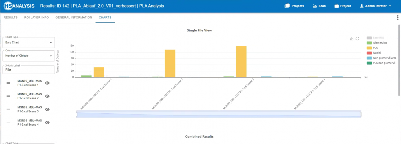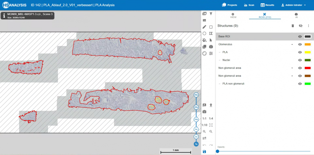 The PLA Analyzer automatically detects glomeruli in human kidney sections and separates glomerular from non-glomerular tissue areas using trained AI models.